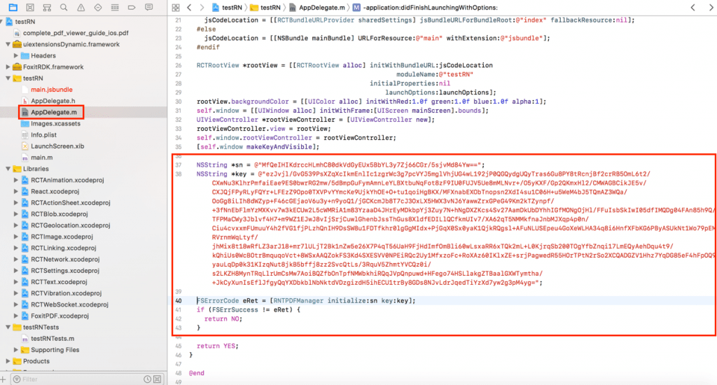 Initialize the Foxit PDF SDK libraries with the license, add the code below to the end of the didFinishLaunchingWithOptions function (See Figure 1-4):
