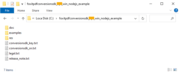 Download the Foxit PDF Conversion SDK zip for Node.js API package and extract it to a new directory “foxitpdfconversionsdk_1_2_win_nodejs_example”, which is shown in Figure 2-1. The release package contains the following folders: