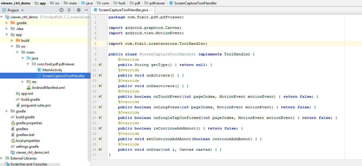 Tool handler and annotation handler will process the events from touch screen or gestures of PDFViewCtrl. When the touch screen and gestures occur, PDFViewCtrl will send the corresponding events to UIExtensionsManager: