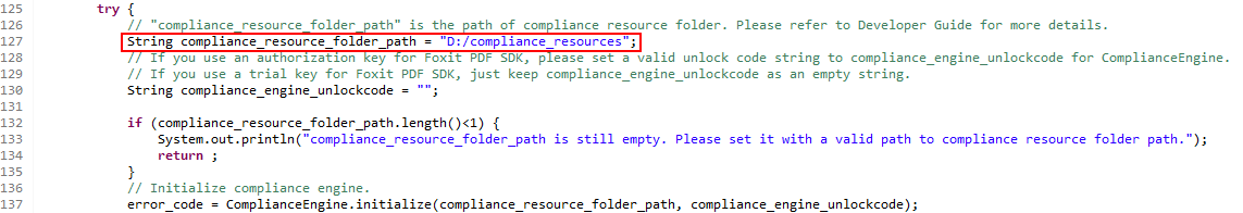 It is necessary for applications to initialize Foxit PDF SDK with license before calling any APIs. The static function Library.initialize(sn, key) is provided in com.foxit.sdk.common.Library. The trial license files can be found in the “lib” folder. Before initializing library, you should load the proper library for your system at first.
